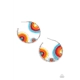 Rows of turquoise, red, orange, yellow, and white seed beads curl around turquoise, orange, and white stone centers, creating colorful rainbows inside a delicate wire wrapped hoop. Hoop measures approximately 2" in diameter. Earring attaches to a standard post fitting.