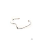 A flat silver bar delicately curls across a dainty white shell-like acrylic cuff, creating a whimsical centerpiece around the wrist.