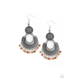 Dainty green, Rust, and Burnt Coral beads dangle from the bottom of a decorative silver crescent plate that links to the bottom of an ornately embossed silver disc, creating a colorful fringe. Earring attaches to a standard fishhook fitting.