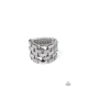 Featuring a flashy faceted surface, staggered rows of rectangular hematite rhinestones alternate with shiny silver bar-like accents across a thick silver band for a gritty-glamorous statement atop the finger. Features a stretchy band for a flexible fit.
