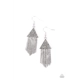 Encrusted in dainty hematite rhinestones, a silver triangle frame gives way to a tapered fringe of flat silver chains for a smoldering effect. Earring attaches to a standard fishhook fitting.