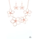 Shiny copper wire delicately twists into oversized blossoms. Varying in size, the airy floral frames delicately link into an asymmetrical display as the layered frames elegantly pop beneath the collar. Features an adjustable clasp closure.