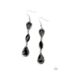 A trio of teardrop and marquis cut black gems fall in succession from the ear. The teardrops are set in silver frames studded with hematite rhinestones for a sparkly finish. Earring attaches to a standard fishhook fitting.