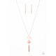 A dainty rose gold tassel sways from the bottom of two triangular discs, one white shell-like and one rose gold, for a flirty pendant at the end of a lengthened rose gold snake chain. Features an adjustable clasp closure.