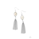 Flecks of shells are encased in a glassy silver bead that is encased in a hammered silver frame. A silver chain tassel swings from the bottom of the iridescent frame, creating an ethereal display. Earring attaches to a standard fishhook fitting.