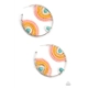 Rows of white, Desert Mist, Marigold, and Burnt Coral seed beads curl around turquoise stone centers, creating colorful rainbows inside a delicate wire wrapped hoop. Hoop measures approximately 2" in diameter. Earring attaches to a standard post fitting.