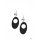An airy black wooden oval frame swings from the bottom of a hammered silver frame, creating a retro lure. Earring attaches to a standard fishhook fitting.