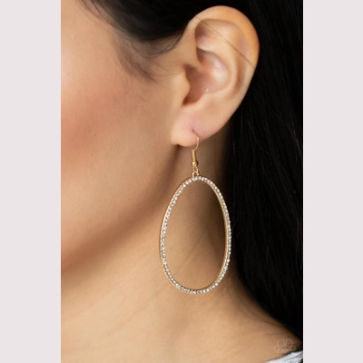 Dotted in dainty white rhinestones, an asymmetrical oval gold frame swings from the ear for a sassy look. Earring attaches to a standard fishhook fitting.