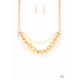 Two strands of dramatic white pearls flank one strand of oversized gold chain, creating statement-making layers below the collar. Features an adjustable clasp closure.