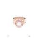 Interwoven rose gold bars delicately encircle an iridescent Pale Rosette gem, creating a mystical centerpiece atop the finger. Features a stretchy band for a flexible fit.