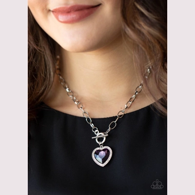 Bordered in glassy white rhinestones, a heart-shaped purple gem is pressed into a shiny silver pendant at the bottom of a bold silver chain below the collar for a flirtatious finish. Features a toggle closure.
