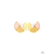 Featuring airy stenciled linear patterns, overlapping yellow and orange crescent shaped frames gather around a dainty white crescent frame, creating a modern display. Earring attaches to a standard post fitting.