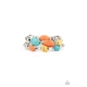 Mismatched turquoise, orange, and yellow stones and oversized silver beads are threaded along stretchy bands around the wrist, creating earthy layers.