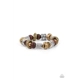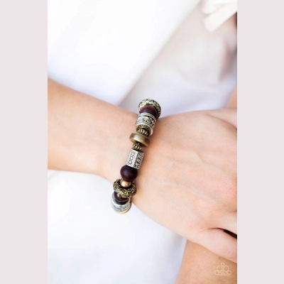 Stamped, studded, and embossed in tribal inspired patterns, a collection of chunky brass and silver beads join earthy wooden beads along a stretchy band around the wrist for an earthy flair.