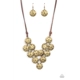 Featuring a hammered finish, a collection of rustic brass discs delicately connect into a netted pendant at the bottom of knotted brown cords for a statement-making look. Features an adjustable clasp closure.