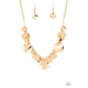 Featuring diamond shaped gold fittings, a mismatched collection of hammered gold discs swings from a classic shiny gold chain below the collar for an eye-catching finish. Features an adjustable clasp closure.