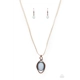 An oversized moonstone is pressed into a copper oval frame, outlined with an unexpected irregular shaped frame. The eye-catching pendant suspends from a double strand of natural cord below the collar for a mysterious finish. Features an adjustable clasp closure.