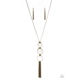 A set of concentric brass circles connected by flat brass discs swings from a lengthened brass chain. A soft brass fringe sways from the bottom ring for an elemental approach. Features an adjustable clasp closure.
