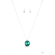 An oversized green gem is pressed into a sleek silver fitting dipped in dainty white rhinestones, creating a glamorous pendant at the bottom of a dainty silver chain. Features an adjustable clasp closure.