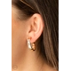 Featuring emerald style cuts, a row of glassy white rhinestones adorn the top front of a thick gold hoop for a classic finish. Earring attaches to a standard clip-on fitting.