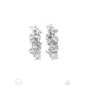 Varying in size, mismatched white rhinestones delicately coalesce into a dainty frame for a sparkly display. Earring attaches to a standard clip-on fitting