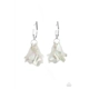 A cluster of iridescent acrylic petals swing from the bottom of a dainty silver geometric hoop, creating an ethereal edge. Earring attaches to a standard post fitting. Hoop measures approximately 1" in diameter.
