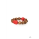 Oversized brown wooden beads and mismatched red stone accents are separated by dainty silver discs and threaded along a stretchy band, creating an earthy centerpiece around the wrist.