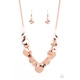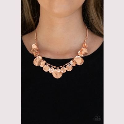 Featuring diamond shaped shiny copper fittings, a mismatched collection of hammered shiny copper discs swings from a classic shiny copper chain below the collar for an eye-catching finish. Features an adjustable clasp closure.