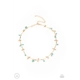 Pairs of dainty gold beads and turquoise stone beads dangle between faceted gold bars that interconnect around the neck, creating an earthy fringe. Features an adjustable clasp closure.
