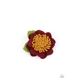 Featuring a lifelike yellow center, scalloped red felt petals layer atop a leafy green backdrop, blooming into a rustic flower. Features a standard hair clip on the back.