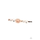 Featuring a brilliant radiant cut peach gem surrounded by a frame of dainty white rhinestones, a mismatched collection of white round and square peach rhinestones coalesce into a stunning display.