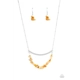 A row of raw cut yellow rocks are threaded along a dainty wire that bows at the bottom of a curved silver bar, creating an earthy pendant. The colorfully stacked frame swings from the bottom of a lengthened silver satellite chain for a glamorously grounding effect. Features an adjustable clasp closure.