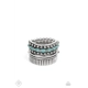 A wide silver band is overlaid with layers of linear texture, smooth silver bars, and antiqued studs. A row of dainty almond shaped turquoise stones flows across the band, adding a splash of color atop the finger. Features a stretchy band for a flexible fit.