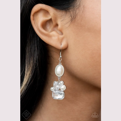 An elegant white oval pearl bead encased in a sleek silver frame gives way to an asymmetrical collection of bubbly pearl beads and sparkling teardrop and emerald cut rhinestones, resulting in an exquisite lure. Earring attaches to a standard fishhook fitting.