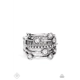 Dazzling white rhinestones encased in daintily studded silver frames scatter across layered silver bands. The centermost band is adorned with raised and studded texture, resulting in a gritty and edgy essence atop the finger. Features a stretchy band for a flexible fit.