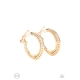 Stenciled in a petal-like texture, a gold frame delicately curves into a floral patterned hoop. Earring attaches to a standard clip-on fitting.