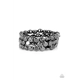 Featuring irregular stone shapes, a shiny series of gunmetal beads are threaded along stretchy bands around the wrist for a bold pop of monochromatic magic.