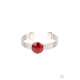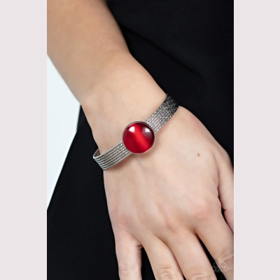 A glassy red cat's eye stone frame sits atop a layered silver cuff that is etched in shimmery textures, creating a glittery centerpiece.