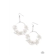 A timeless collection of iridescent crystal-like accents, dainty white pearls, and white floral frames delicately cluster along the bottom of a silver hoop, creating a glamorous glow. Earring attaches to a standard fishhook fitting.