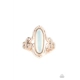 An elongated dewy white opal is nestled inside an ornately swirled rose gold frame resulting in a timeless allure atop the finger. Features a dainty stretchy band for a flexible fit.
