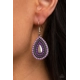 The front of a studded silver teardrop frame is dotted in alternating rows of light and dark purple beads, creating a colorful lure. Earring attaches to a standard fishhook fitting.