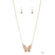 Bordered in glassy white rhinestones, an airy gold butterfly is dotted in dainty white rhinestones and shiny gold emerald-like accents as it flutters from two chains below the collar for an enchanting fashion. Features an adjustable clasp closure.