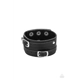 A pair of black leather buckles are buckled in place across the front of a rustic black leather band for a seasonal look. Features an adjustable snap closure.