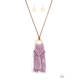 Strands of Amethyst Orchid yarn-like thread delicately weaves into a knotted macrame pattern at the bottom of a white wooden hoop. Dainty strands of brown suede knot around the pendant for an earthy flair. Features an adjustable clasp closure.