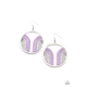 Infused with a glittery row of white rhinestones, shiny purple arcs curve into juxtaposed frames inside a classic silver hoop, creating a colorful art deco inspired centerpiece. Earring attaches to a standard fishhook fitting.