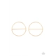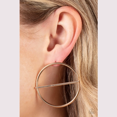 A glistening gold bar runs horizontally across the center of an oversized gold hoop, adding a timeless twist to the classic display. Earring attaches to a standard post fitting.
