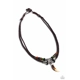 A mismatched collection of colorful wooden beads, floral frames, and silver accents glide along strands of brown twine and leathery cording, creating colorful layers. A rustic gator-like tooth swings from the lowermost strand, creating an adventurous pendant. Features a button-loop closure.