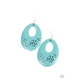 The bottom of a turquoise blue wooden teardrop frame features bird and floral cutouts, creating a whimsical centerpiece. Earring attaches to a standard fishhook fitting.