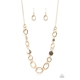 A mismatched assortment of hammered gold discs, textured gold links, glistening gold rings, and asymmetrical gold links boldly interlock below the collar for a gritty fashion. Features an adjustable clasp closure.