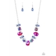 Featuring glassy, iridescent, and oil spill finishes, a mismatched collection of emerald cut blue, square multicolored, and teardrop pink gems delicately connects below the collar for a stellar statement. Features an adjustable clasp closure.